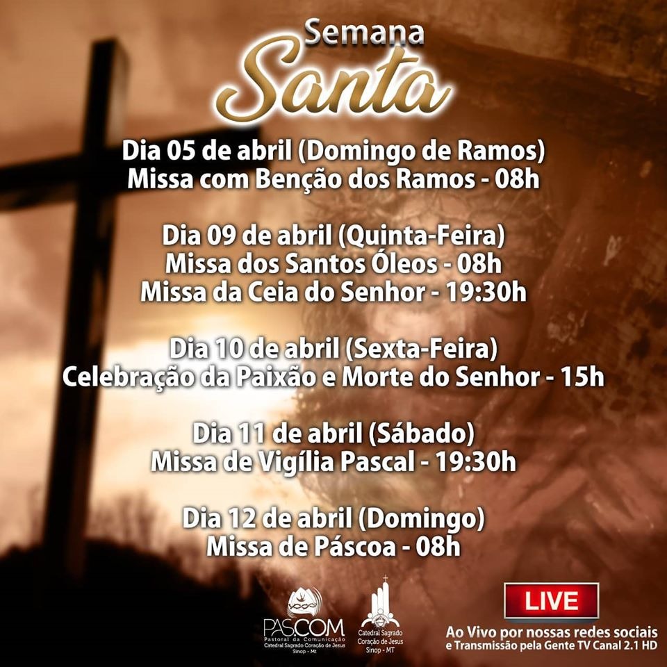 QUINTA FEIRA SANTA: Somente na Catedral missa ás 8h, com bênção dos santos óleos para a crisma, batismo e unção dos enfermos, e a renovação das promessas sacerdotais dos padres. Alguns padres presentes e os demais acompanhem e participem pelas redes sociais.